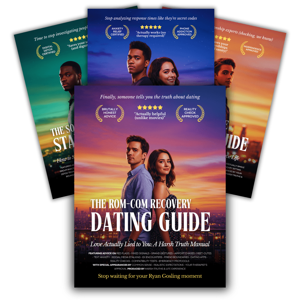That’s why I created the Rom-Com Recovery Dating Guide... a funny, brutally honest, reality-based toolkit to help you cut through the noise, calm your dating anxiety, and finally date with confidence.